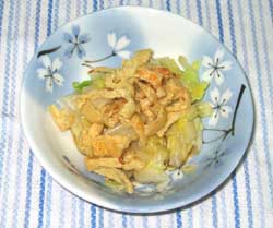 3.キャベツの水分を絞り、器に盛り、油揚げを飾ります。