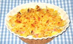 2.オーブン皿にポテトを平らに入れ、ベーコン、ホールコーンを散らし、